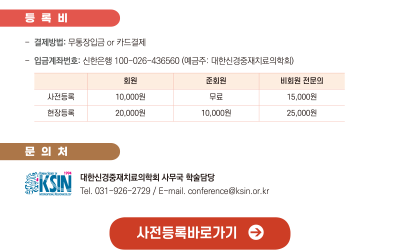 ▷ 등록비: 사전등록 10,000원 (우리은행 1005-201-317623, 예금주: 대한신경집중치료학회)